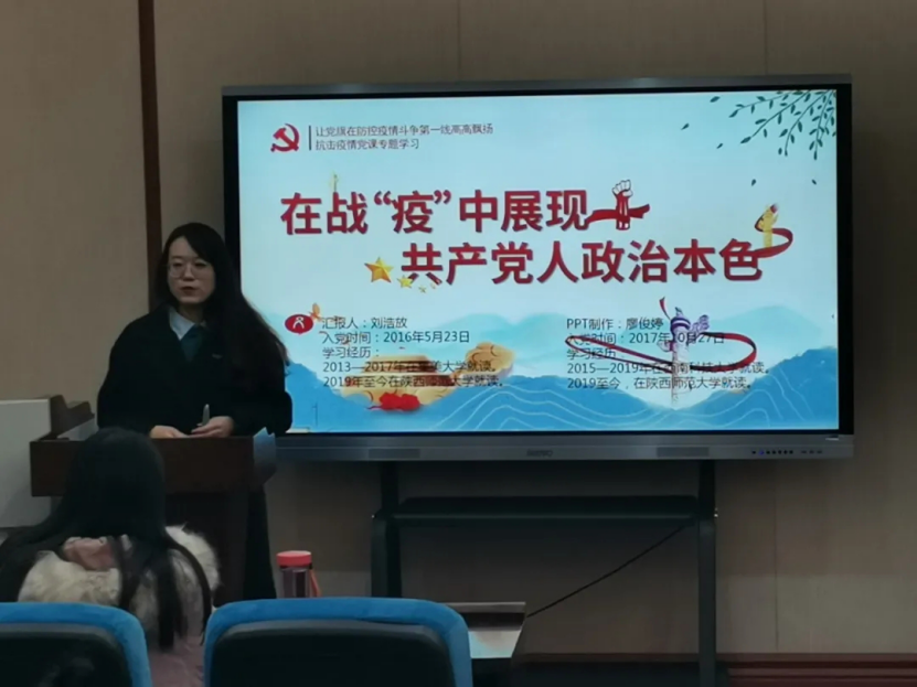 第二党支部刘浩放同志以“在战疫中体现共产党人的政治本色”为主题,用鲜活的事例展现了广大党员同志在这场没有硝烟、始料未及的战役中勇当先锋、敢打头阵的奋斗精神,用行动展现的广大共产党人的政治本色。