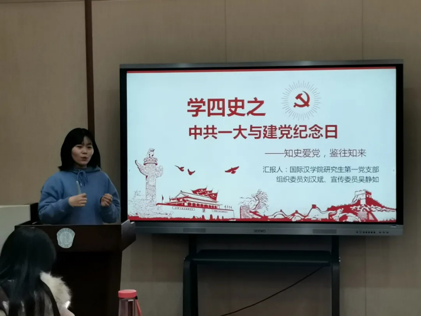 随后,第一党支部宣传委员吴静如同志以“学四史之中共一大与建党纪念日”为主题,带大家回顾了红船精神、建党纪念日,并梳理了中国共产党发展历程:党从红船诞生,从红船出征,从红船走向全国执政,带领中华民族走向伟大复兴;