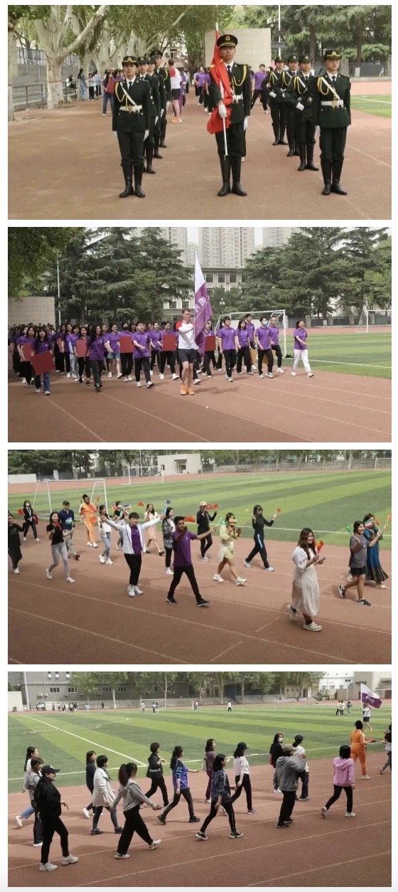 学院党总支书记马兰、院长石洛祥、副书记张昊、副院长贾泽林、孙建伟、李敏,工会主席曾柱、各教研室负责人、教师代表、行政老师、学生辅导员以及全体中外学生参加运动会。开幕式由副书记张昊主持。