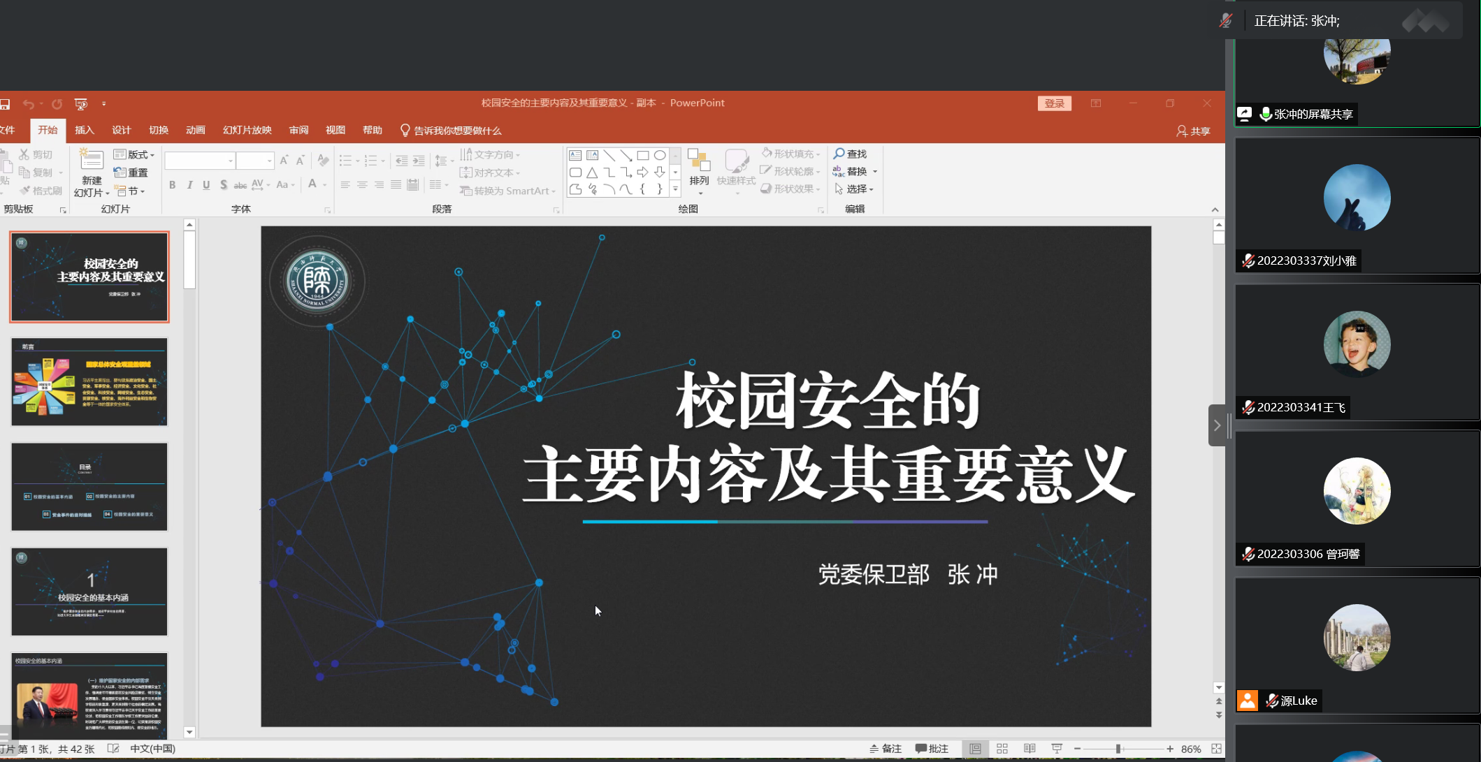 张冲以总体国家安全观的内涵引入了校园安全这一主题,从校园安全的基本内涵、 校园安全的主要内容 、安全事件的应对措施以及校园安全的重要意义这四大板块深入浅出、清晰明了地进行了细致的讲解。