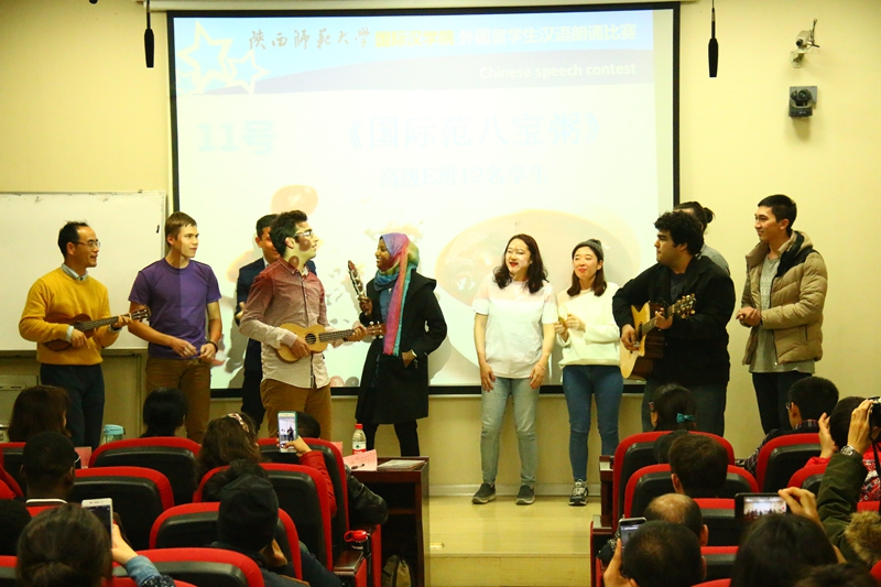 高级E班的何浩等10名学生,分饰不同角色----红枣、大米、莲子、桂圆、花生、小米等,各司其职,熬出了冬日里养胃又暖心的“国际范八宝粥”。他们的表演让我们领悟到,无论自己是谁,只要能发挥个人特长,就能给这个世界贡献自己最好的价值。他们的表演,有说有笑,有跳有唱,全场气氛都被他们感染,台下观众们也欢腾一片。