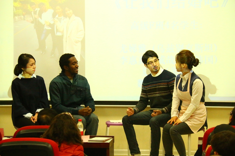 文化差异总能酝酿出一些有趣的事情,由F班侯夏伟等五位留学生给我们带来的幽默情景剧《让我们结婚吧》就把这种趣味展现的淋漓尽致。他们以中外青年婚恋为切口,用送礼等情节将一系列啼笑皆非的故事展现给在场观众。当所有误会化成彼此理解,最终迎来了皆大欢喜的结局。他们的故事告诉我们,文化各有不同,只要我们尝试去理解彼此,冲突可以变成和谐共处,矛盾可以变成彼此尊重。