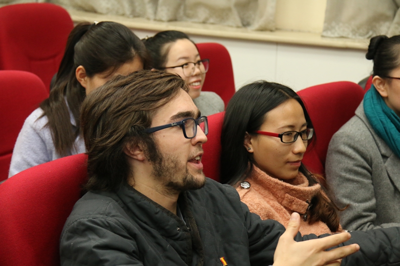 一层报告厅,与他们的美国“小鲜肉”老师一道,学习并交流美式英语中的俚语及美国文化。