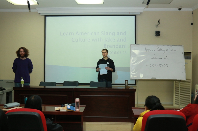 俚语课堂以一段围绕着7个美式俚语单词的录音拉开序幕。贴心的贾柏和新舜担心学生们在起始阶段跟不上录音的节奏,特意将录音内容敲击成文字在屏幕上展示,逐字逐段引导学生们理解。随后的课堂中,贾柏和新舜将录音中出现的7个美式俚语单词单独提取出来,逐一分析并讲解他们的日常用意以及在口语中的其他含义和用法。随后,思维活跃的“小鲜肉“老师们,还通过播放热门美国歌曲MV的方式,让学生们在享受视觉盛宴的同时学习歌词中地道的美语用法。课堂上,其余美国富布莱特项目留学生也友情帮忙,在课堂上与中国学生互动交流,参与并协助贾柏和新舜的课堂教学。