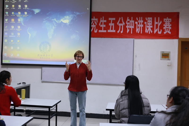二楼多媒体教室拉开帷幕。本次比赛于2015年12月18日进行了初赛,学院2015级全体研究生参加了此次比赛,初赛中共有18人进入决赛。决赛当天有幸邀请到了美国英语学会西进汉语项目主管Crista Cornelius女士、美国哥伦比亚大学刘乐宁教授、耽美小说