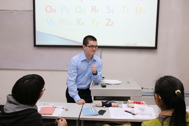 在整体介绍了本学期的课程安排之后,Patrick老师开始第一堂课——“音标教学”。为了提升课堂教学效果,他将学生们分成六个小组,并邀请来和自己同一项目的五名美国学生作为助教,每人负责一组,让学生们一一发声,发现并纠正他们的读音问题。反复朗读练习之后,Patrick老师提升了课堂难度,通过给音标找对应单词和给单词标注音标的方式,考察学生对于音标的掌握程度及相似发音的辨别能力。采用口语实训的教学方法,迫使学生主动发声,暴露问题、解决问题而后加深对正确发音的记忆度。