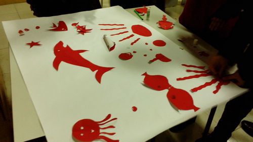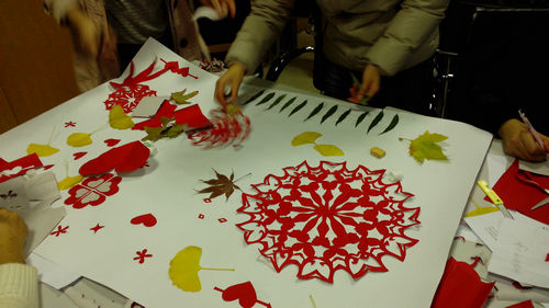晚7:00,活动准时开始。活动中参与者被分为7组,活动围绕了解剪纸、熟悉剪纸的剪法、抽取主题、通过游戏抢夺道具、制作主题剪纸等环节展开,由国际部部员负责带领外国留学生了解、制作剪纸。参与者了解完剪纸的相关视频——《剪纸姑娘》后,剪纸的制作正式开始。活动中还穿插了精彩的抢道具游戏环节,两轮游戏各具特色,充分体现了设计者的匠心独运。尤其是第二轮游戏“水果蹲”,由于参与度更广,可操作性更强,全场气氛空前热烈。
