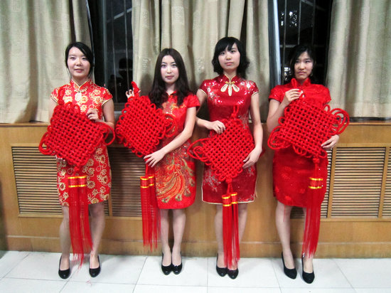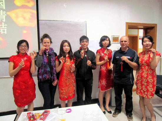 活动在主持人激情澎湃的解说中拉开了序幕。首先大家一起观看了有关“中国结”的纪录片,了解了其悠久的历史和深厚的文化内涵。随后,伴随着悠扬的古乐,四位身着旗袍的美女出场了,她们手持喜庆的中国结为大家展示。中外学生们欣赏着华美的服饰,聆听着悦耳的琴音,联想着有关中国结的动人传说,品味着远古的神秘与东方的灵秀,不禁陶醉其中。