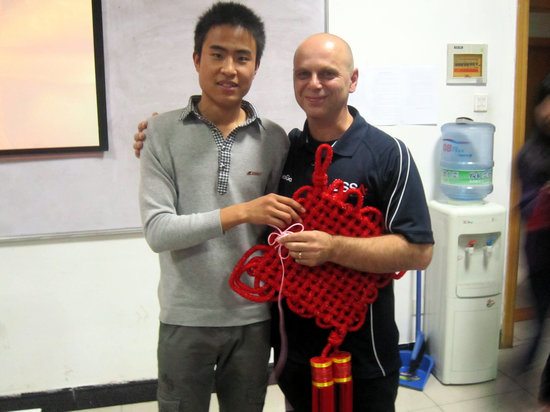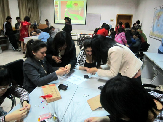 见识了品种多样、风格各异、寓意美好的“中国结”,大家都跃跃欲试,想要编织属于自己的中国结。在指导老师的简要讲解之后,大家开始了“中国结”的制作。中外学生们集思广益,勇于创新,在原有模版的基础上,充分发挥自己的聪明才智,不断把自己的奇思妙想应用于实践操作之中,“中国结”在这群能工巧匠的手里被不断赋予了新的形式和内涵。无论是小巧玲珑的酢浆草结、浪漫传情的同心结,还是制作较为复杂的草花结,都有模有样。一根简单的丝绳,在灵巧的手中还被编织成了精美的手链、项链,让大家赞不绝口。随后主持人进行了一场别开生面的颁奖活动,先后颁发了“最可爱奖”、“ 最具创意奖”、“ 最佳实力奖”、“ 最美观奖”等十多个奖项,给参与者以最大的认同和鼓励,将本次活动引向高潮。最后,作为特约嘉宾的终南笛箫社的同学为大家进行了笛箫演奏,整场活动在美妙的乐曲声中结束。