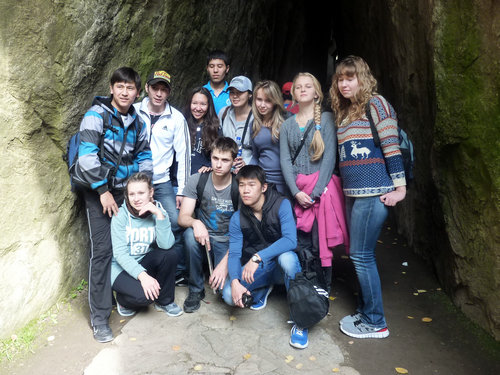 半山腰有当地人卖山货土产,来自哈萨克斯坦的东干族留学生就奋勇当先地操着一口纯正的陕西话与商贩讨价还价,聊的热火朝天,其他国家的学生见状也不甘示弱,纷纷用汉语大胆上前交谈。留学生们在学校所学的汉语此时纷纷派上用场,好不热闹。山路艰辛,但登上山顶的畅快无可比拟。俯视山下,天池风光尽收眼底,旁边一片石林,头顶绿枝红叶,摇曳生姿。