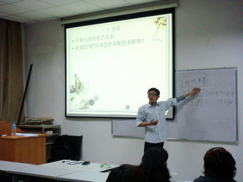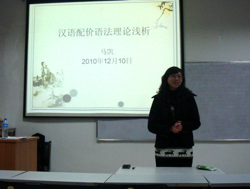 马凯同学先以水的化学式引出配价语法的溯源和发展,又通过各种生动有趣的例子介绍了配价的性质,最后引出从配价角度解决汉语动词分类的问题。整个报告过程,互动、有生气,同学们就报告中的问题进行了交流和讨论,真正体现出了论坛的意义。邵英老师做了精彩点评,对马凯同学的精心准备给与充分肯定,并就汉语配价问题提出指导意见。刘琨老师做了总结性发言,指出汉语配价在对外汉语教学中的实际运用问题。