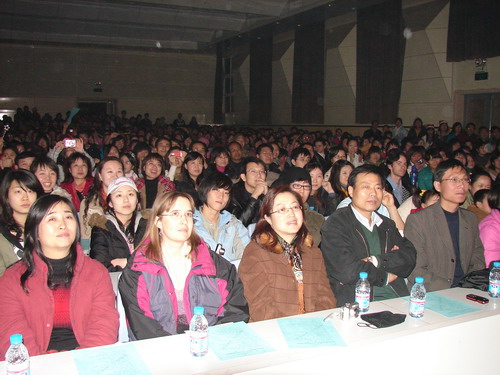 的团总支书记李敏老师演唱了《长大后我就成了你》和《幸福山歌》,优美动听的歌声令现场的观众如痴如醉;最后晚会在05级对外汉语班的合唱《让世界充满爱》中落下帷幕。