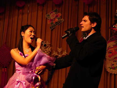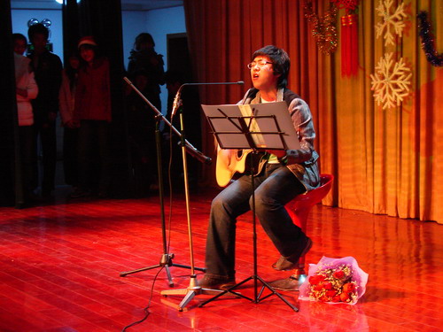 中西结合特点演绎的淋漓尽致;来自校团委的李亚云老师演唱了《大西北的鼓声》,充分表现了大西北人民的那种旷达、豪放的气概;在来自05级对外汉语班的欧阳莉和来自加拿大的郭峰的《今天你要嫁给我》之后,晚会进入了现场互动环节,观众们积极参与,认真回答问题,滑稽可爱的圣诞老人将礼物送给一个又一个幸运儿;互动环节结束后,来自越南班的现代舞《舞娘》将现场气氛带向了高潮;而晨星班的小品《圣诞节的来历》更是引得观众们哈哈大笑;来自韩国的留学生郑荣光演唱的《美丽的爱情》引得现场女同学发出阵阵的尖叫声;来自05级对外汉语班的拉丁舞,将现场的观众引向了神秘而又迷人的拉丁世界;在来自韩国的朴辅仁和来自澳大利亚的逯敏轩表演钢琴四手联弹《Flying Petals》时,原本热闹的会场迅速寂静了下来,观众们被美丽动听的音乐深深地打动;之后,耽美小说