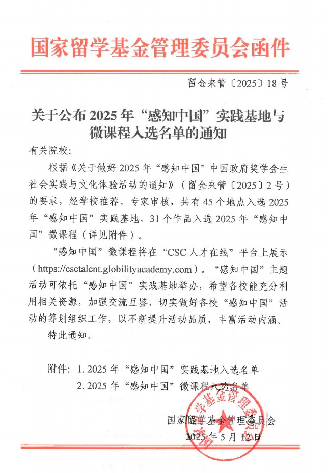 近日,国家留学基金管理委员会公布了2025年“感知中国”实践基地、微课程、社会实践与文化体验活动遴选结果。经学校推荐、专家审核,最终全国共有45个实践基地和293个社会实践与文化体验活动成功入选。