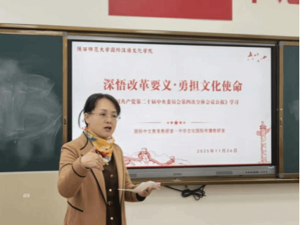 会上,全体教师逐字逐句研读全会公报原文,重点围绕公报中“提升中华文明传播力影响力”“扩大高水平对外开放”“统筹教育强国建设”等与学院工作紧密相关的部署展开热议。老师们结合国际中文教学中的教学改革、跨文化课堂实践、留学生文化活动等工作实际交流感悟。大家一致认为,全会提出的文化强国建设要求,为国际中文教育和中华文化国际传播工作指明了方向,作为一线教师,需将全会精神融入教学创新,助力中华文化更好走向世界。