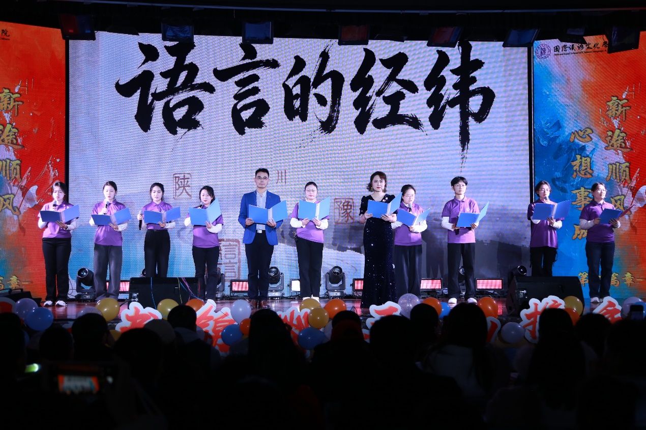 朗诵《语言的经纬》由刘琨、曾柱等 11 位师生共同演绎,他们声音铿锵有力、情感真挚饱满,将语言作为沟通桥梁、文化载体的意义娓娓道来,引发了中外学子对跨文化交流的深刻思考。