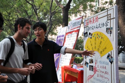 在为期三天的纳新活动中,我们社团以其突出的国际性、丰富多彩的汉语角活动,汉英结合的双语锻炼契机吸引了众多同学前来咨询报名。同学们对异域文化的求知欲、对友邦同学的欢迎心、对中华文明的自豪感在九月的秋风中飞舞。