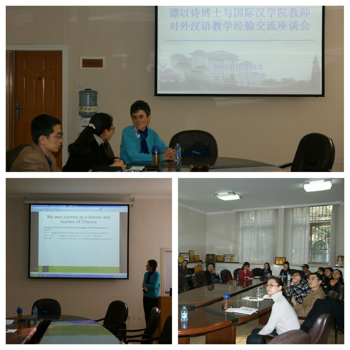 留学生规模、师资队伍、汉语教学及汉语国际教育专业学生培养等方面的情况。随后,与会教师就汉语国际教育教材选择、学生毕业去向、课程教学方法等问题与谭以诗博士进行了深入的交流与分享。