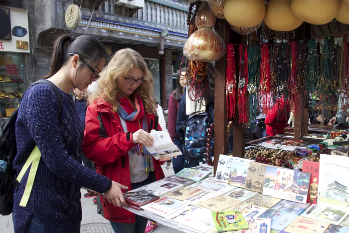 接着,同学们三五结伴,徜徉于书院门,观画赏古,乐意无穷。有产自西域的青白玉石,茶马古道上的中国好茶,雕刻精细的葫芦埙及种种名目繁多的传统管弦乐器。留学生每到一处,导游亲切讲解,店主热情相迎。在赏玩古埙的时候,导游还试着从店中捧起一口八孔埙,即兴的为留学生送上雄浑有力的一曲,立刻吸引了留学生的观摹。来自俄罗斯的靓仔Parshin Sergey也兴高采烈地拿起一口比两个成人的拳头还大的古埙学起来,顿时现场多了几分默契。但由于埙看着简单,实则要演奏好需要好好的学习一番,故现场也不时发出奇怪的像牛吼的嗡嗡声,引来阵阵笑声。