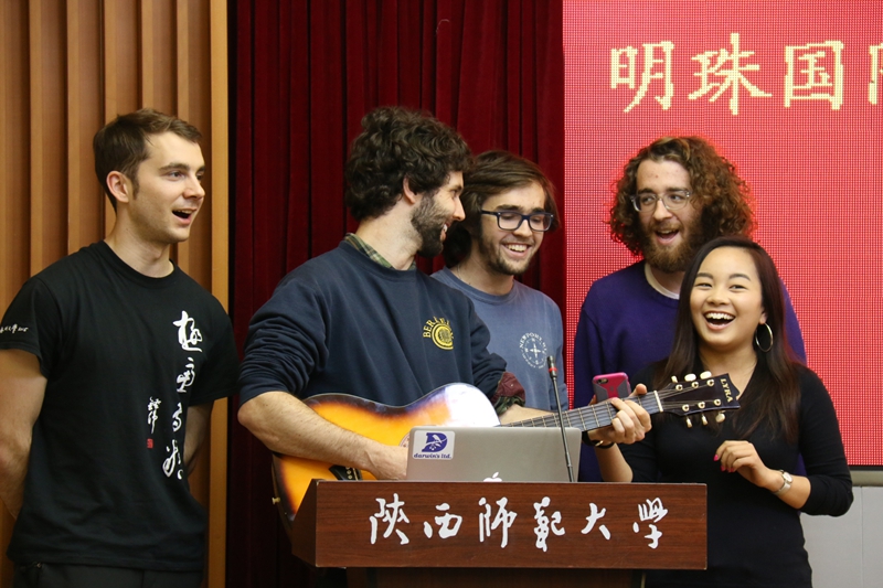 青年教师孙建伟分别作为获奖学生和教师代表发言。来自美国的留学生笨笨以及富布赖特项目留学生戴维和他的小伙伴们还分别表演了《诗经·木瓜》吟诵和《月亮代表我的心》歌曲合唱,用简短的学业汇报演出表达对学习汉语的热爱以及对明珠国际集团和耽美小说