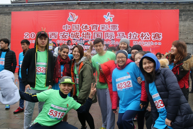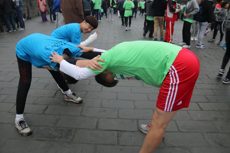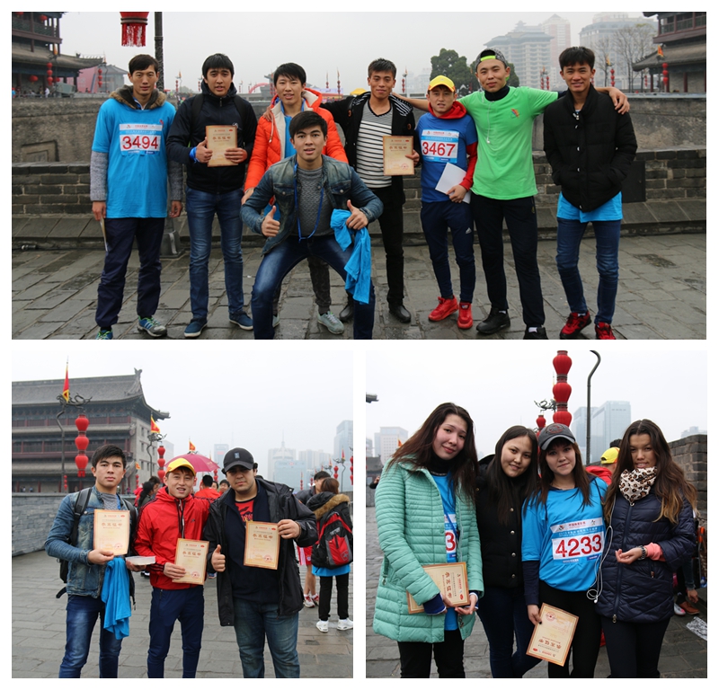 上午九点二十分,马拉松比赛的枪声正式鸣响。尽管天气寒冷、阴雨连绵,选手们各个不畏严寒,热情饱满,拼尽全力向着终点迈步,在男子13.7公里比赛中,来自哈萨克斯坦的马云和韩国的金廷洵均跑进前20名。未参赛的5名留学生在赛前自发组成拉拉队,为选手们搬运食品、看护物品、加油助威、拍摄照片。最终,所有跑完全程的选手都获得参赛证书一张,赛后大家依然意犹未尽,在城墙上一同奔跑,摆出一起冲过终点线的造型。