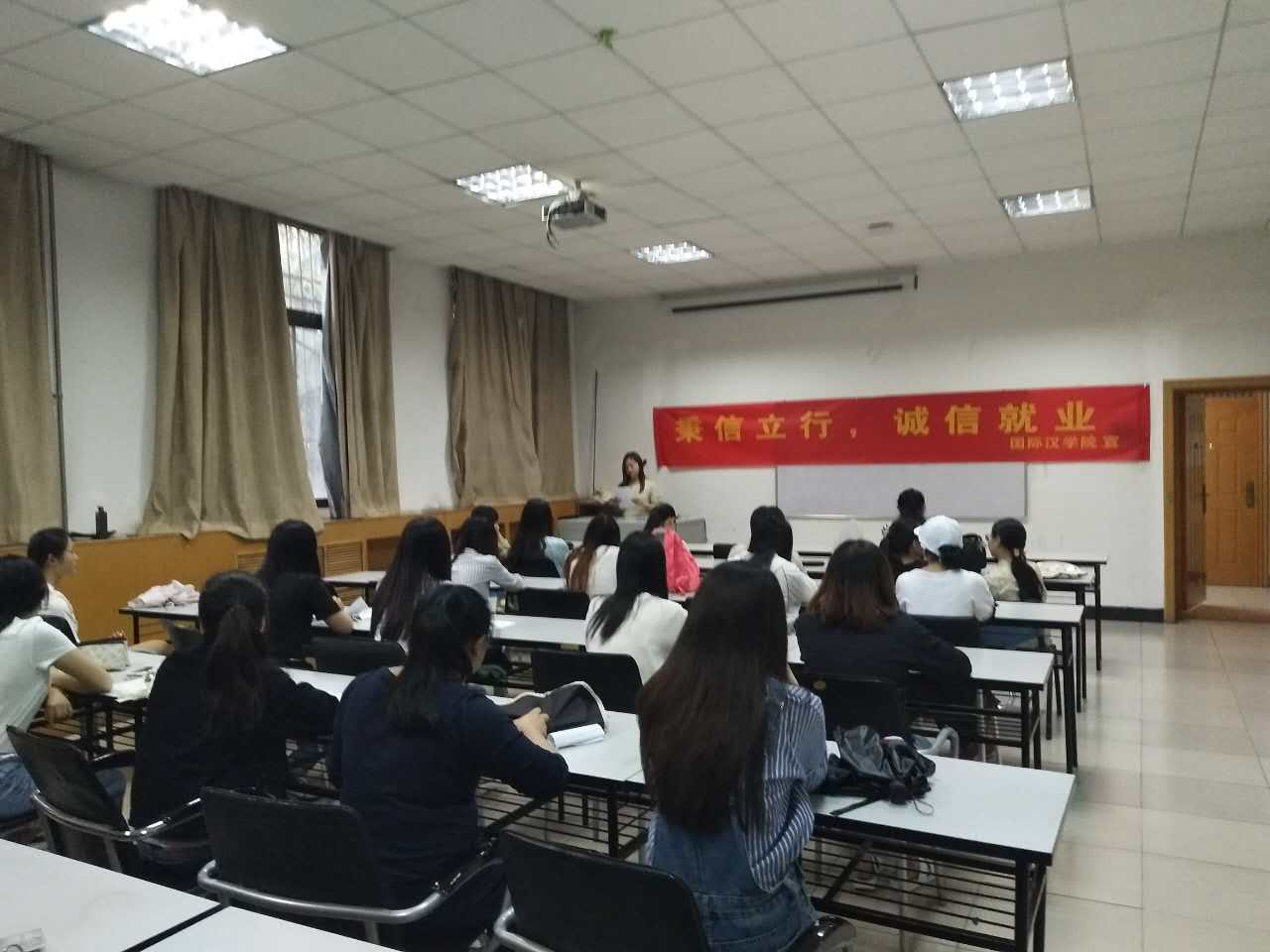 首先,毕业班辅导员樊琳丽对本科毕业生实时的就业情况进行了总结分析,督促已签约的同学及时在网上填报就业信息,尚未就业的同学要时刻保持就业自信,主动出击,多尝试,多总结,不断提升完善自我。同时樊琳丽强调,面对激烈的就业竞争,在求职过程中要坚守诚信,严格遵守国家和学校的就业政策,倡导大家“秉信立行,诚信就业”。