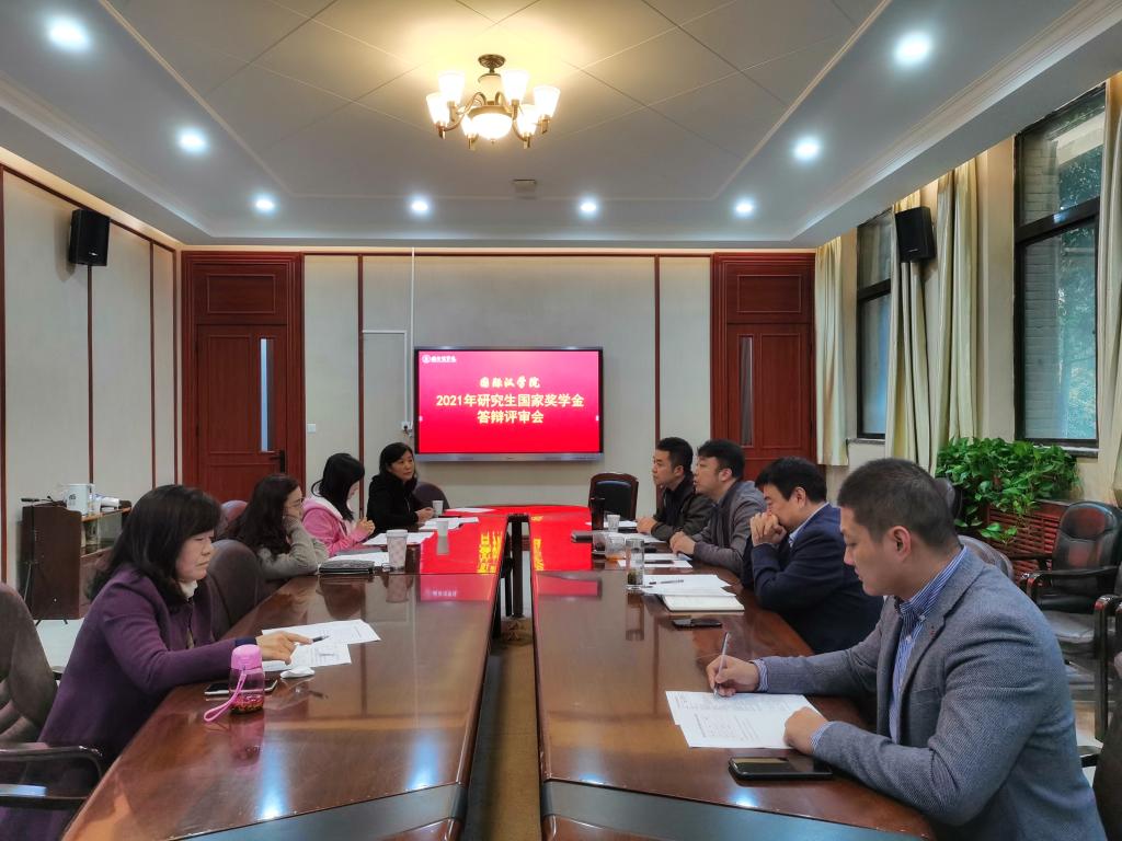 2021年研究生国家奖学金答辩评审会在学院一层会议室举行,副院长石洛祥,党总支副书记张昊、副院长贾泽林,研究生导师邵英、李琼、曾小梦,研究生秘书何建梅、党总支组织员兼研究生辅导员朱红楠,研究生代表殷旭升、肖扬、孙沐霖参加了此次评审会,会议由石洛祥主持。