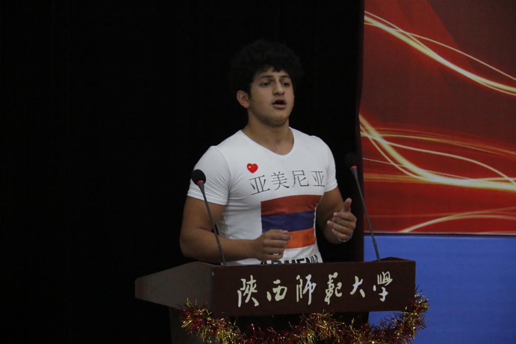 邵英、亚美尼亚籍留学生迪然、刘汉斌、英国籍留学生苏德锐分别代表学院教师、留学生老生、中国研究生新生和留学生新生做了发言。学院副院长吴媛代表学院向全体新生代表赠送了学习用品及校徽,开学典礼在与会人员的大合影中圆满结束。