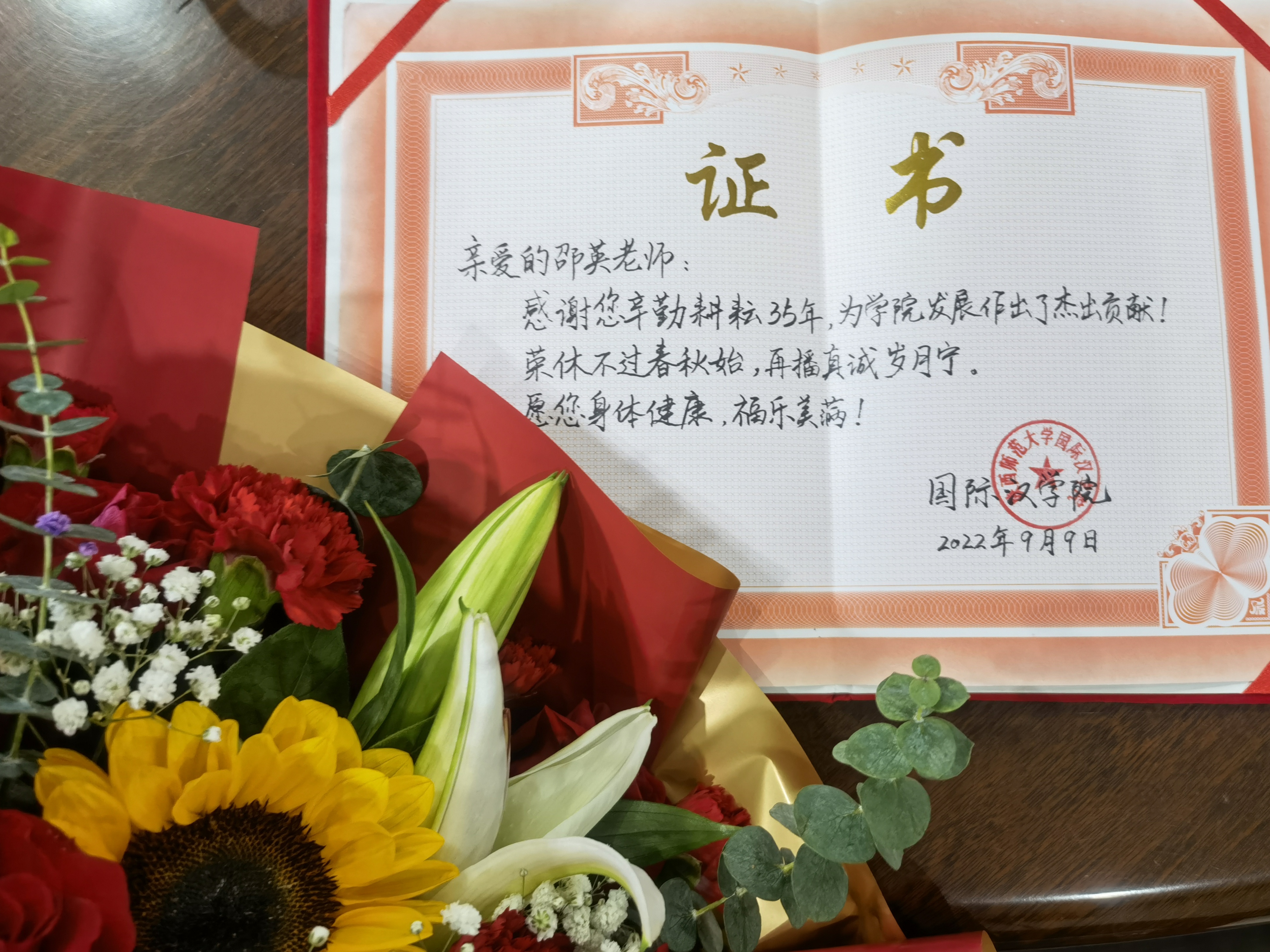石洛祥院长回顾了邵英老师从教35年以来为学院发展做出杰出贡献,代表学院向邵英老师数十载投身留学生教育事业,服务学校发展的辛勤付出致以崇高的敬意,并为邵英颁发了荣休证书。