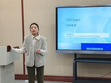 随后,学院招生办公室和学工组相关负责老师分别展开详细讲解。张丽老师对留学生教务进行了全面说明,让学生们清晰了解课程安排、学业要求等关键内容;畅晓梅老师为学生们准备 HSK 考试提供了重要指导;马艺玄老师聚焦签证办理问题,对签证种类、延期流程以及临时住宿登记表的相关事宜进行讲解;刘美君老师介绍了学院的本科和研究生学习项目;欣元老师特别强调了安全教育的重要性。他从交通安全、预防诈骗、非法就业以及校园活动等多个方面进行讲解;留学生管理干部赵晓越讲解了宿舍区域注意事项、处罚制度以及校外住宿注意事项,使学生们对住宿相关规定有了清晰认知。