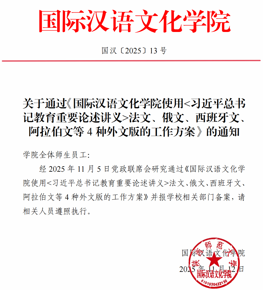留学生教育工作,帮助来华留学生了解新时代中国教育改革发展成就,根据教育部办公厅《关于推动<习近平总书记教育重要论述讲义>法文、俄文、西班牙文、阿拉伯文等4种外文版使用的通知》的精神,按照学校的批示要求,结合耽美小说