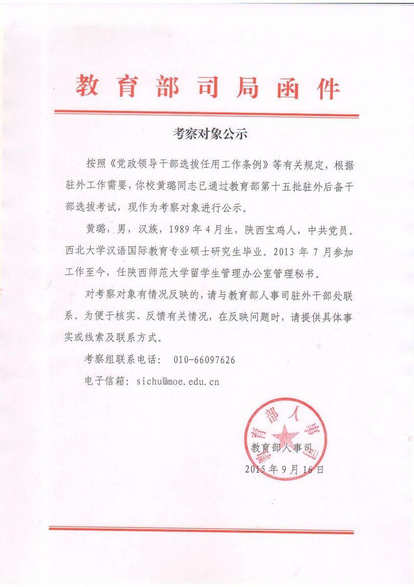 按照《党政领导干部选拔任用工作条例》等有关规定,根据驻外工作需要,你校黄璐同志已通过教育部第十五批驻外后备干部选拔考试,现作为考察对象进行公式。公示期三天,从2015年9月16日到9月18日。